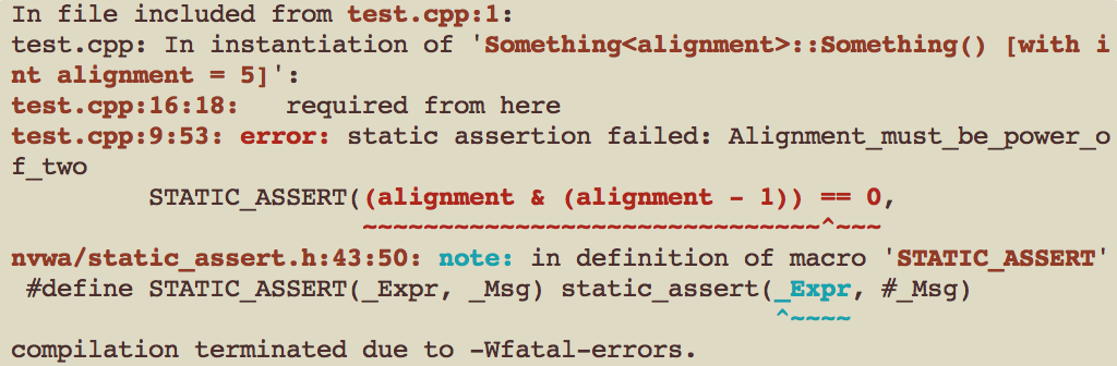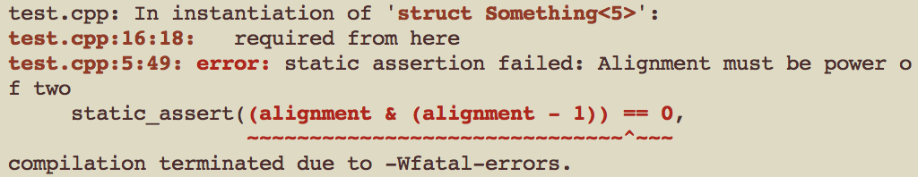 C++98 的 assert 允许在运行时检查一个函数的前置条件是否成立。没有一种方法允许开发人员在编译的时候检查假设是否成立。比如,如果模板有个参数 alignment,表示对齐,那我们最好在编译时就检查 alignment 是不是二的整数次幂。之前人们用了一些模板技巧来达到这个目的,但输出的信息并不那么友善。比如,我之前使用的方法,会产生类似下面这样的输出: